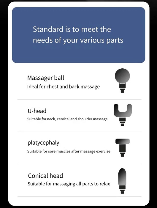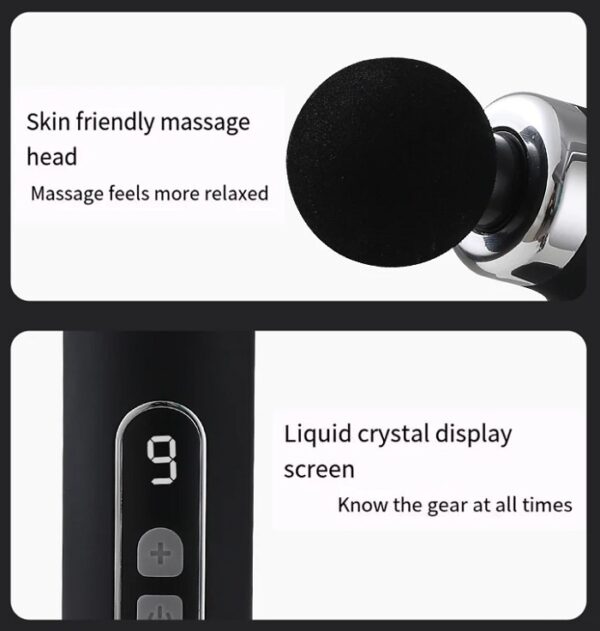 Επαναστατική συσκευή μασάζ και μυοχαλάρωσης Fascial Gun με εναλλασσόμενες κεφαλές για εφαρμογή σε όλα τα σημεία του σώματος που επιθυμείτε. Ιδιότητες: Ανακουφίζει από τον μυικό πόνο και το πιάσιμο, Αυξάνει το εύρος κίνησης, Βελτιώνει την κυκλοφορία του αίματος, Επιταχύνει το ζέσταμα και την αποκατάσταση, Ανακούφιση από μυοσκελετικό πόνο. Χαρακτηριστικά: Διείσδυση στους μύες σε βάθος έως 7mm, Ψηφιακή οθόνη, Επαναφορτιζόμενη μπαταρία (περιλαμβάνεται καλώδιο φόρτισης), 9 ταχύτητες (3200±200 rpm ), 4 εναλλασσόμενες κεφαλές για ευρεία εφαρμογή σε όλο το σώμα. Αθόρυβο <45db, Χρόνος φόρτισης: 3 ώρες, Αυτονομία έως 60 min (σε χαμηλή ένταση). Διαστάσεις συσκευής: 12 x 17 x 4cm. Εμπεριέχονται οδηγίες χρήσης στα Αγγλικά και στα Κινέζικα.