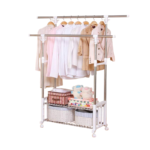Τροχήλατη κρεμάστρα δαπέδου διπλή με 2 ράφια πολλαπλών χρήσεων, ιδανική ως έπιπλο εισόδου ή για την οργάνωση των ρούχων στο δωμάτιό σας. Μεταλλικός σκελετός. Ύψος ρυθμιζόμενο 95-160cm. Μήκος κρεμάστρας ρυθμιζόμενο 100-150cm. Πλάτος: 40 cm.