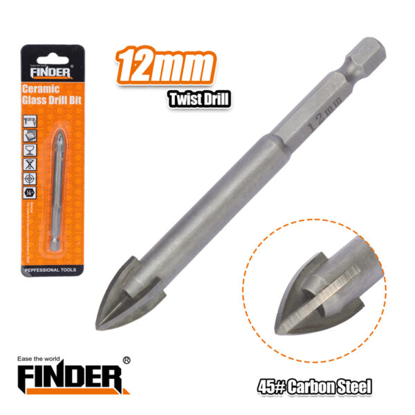 Τρυπάνι τετράκοπο γυαλιού και πλακιδίων της Finder, κατασκευασμένο από ατσάλι #45 Carbon Steel. Μέγεθος: 12mm.