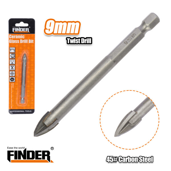 Τρυπάνι τετράκοπο γυαλιού και πλακιδίων της Finder, κατασκευασμένο από ατσάλι #45 Carbon Steel. Μέγεθος: 9mm.