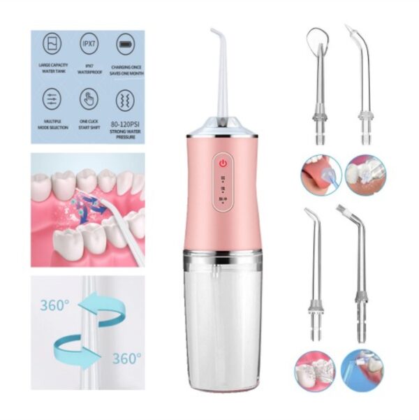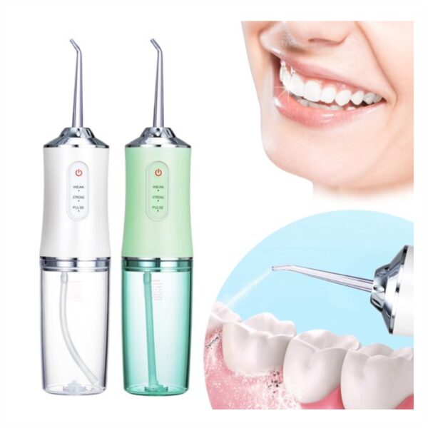 Φορητή συσκευή καθαρισμού δοντιών με πίεση νερού. Ένα σετ καθαρισμού χρησιμοποιεί την πίεση του νερού για τον καθαρισμό των δοντιών, ακόμα και στα πιο δύσκολα σημεία. Διευκολύνει αρκετά ανθρώπους που έχουν "σιδεράκια" ή "γεφυρα" καθώς μπορεί να αφαιρέσει αποτελεσματικά υπολείμματα τροφών που το παραδοσιακό οδοντικό νήμα δεν εξυπηρετεί αυτές τις περιπτώσεις. Ισχύς 5W. Χωρητικότητα νερού 220ml. Τρείς λειτουργιές.