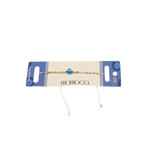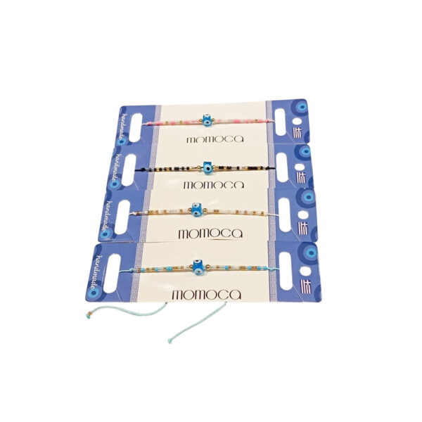 Καλοκαιρινά βραχιόλια με πολύχρωμες χάντρες και κεντρικό στοιχείο κυβικό γαλάζιο ματάκι για προστασία και στυλ. Διαθέτουν αυξομειούμενο κορδόνι και εφαρμόζουν εύκολα σε κάθε καρπό. Ιδανικά ως τουριστικά σουβενίρ, δώρα φιλίας ή καθημερινό αξεσουάρ. Πωλούνται σε σετ των 12 τεμαχίων με καρτελάκι παρουσίασης.