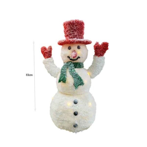 Εντυπωσιακός χριστουγεννιάτικος χιονάνθρωπος ύψους 83cm με ενσωματωμένο φωτισμό LED. Με καπέλο, κασκόλ και γιορτινά χρώματα, δίνει ζωντάνια και χαρούμενη διάθεση στη διακόσμηση σας. Ιδανικός για το σπίτι, την είσοδο ή τη βιτρίνα καταστήματος, δημιουργεί μοναδική γιορτινή ατμόσφαιρα.