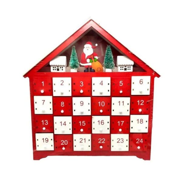 Χριστουγεννιάτικο ξύλινο διακοσμητικό ημερολόγιο με φωτισμό σε σχήμα σπιτιού με mini ντουλαπάκια. Μπορείτε να το τοποθετήσετε σε όποιο σημείο θέλετε, για να δώσετε μια πιο γιορτινή και νοσταλγική νότα. Είναι πολύ πρακτικό, αφού εκτός από διακοσμητικό, μπορεί να χρησιμοποιηθεί για να τοποθετήσετε μικροαντικείμενα ή ακόμα και τα κλειδιά σας! Η συσκευασία περιλαμβάνει το διακοσμητικό ξύλινο ημερολόγιο.