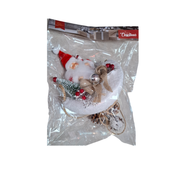 Χριστουγεννιάτικο κρεμαστό διακοσμητικό φεγγάρι με φιγούρα Άγιου Βασίλη, και εντυπωσιακό συνδυασμό στολιδιών με υπέροχες λεπτομέρειες. Διαστάσεις: 80*20cm.