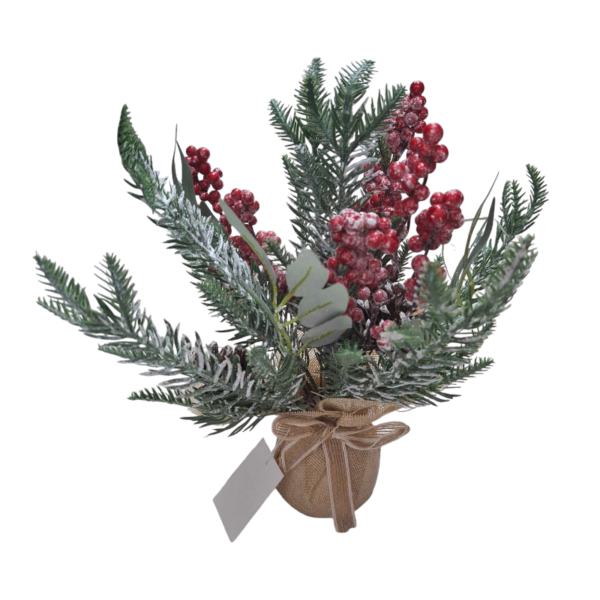 Χριστουγεννιάτικο διακοσμητικό δεντράκι με επιτραπέζια βάση-πουγκί και εντυπωσιακή σύνθεση με στολίδια και υπέροχες ρεαλιστικές λεπτομέρειες. Ύψος: 20cm.