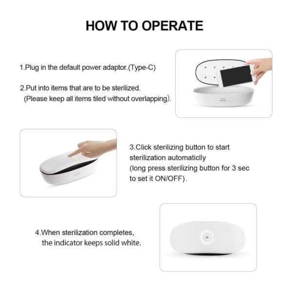 Ανοίξτε το καπάκι, τοποθετήστε τα αντικείμενα που θέλετε να αποστειρώσετε μέσα, κλείστε το καπάκι, πατήστε μια λειτουργία έναρξης 0,5 δευτερολέπτου για να ξεκινήσει η αποστείρωση 1 λεπτό, μετά από 1 λεπτό, θα απενεργοποιηθεί αυτόματα και θα έχει μια φωνητική προτροπή ( αποστείρωση για να υπενθυμίσει ότι η αποστείρωση είναι ολοκλήρωση Πατήστε 3 δευτερόλεπτα για να απενεργοποιήσετε τον αποστειρωτή.