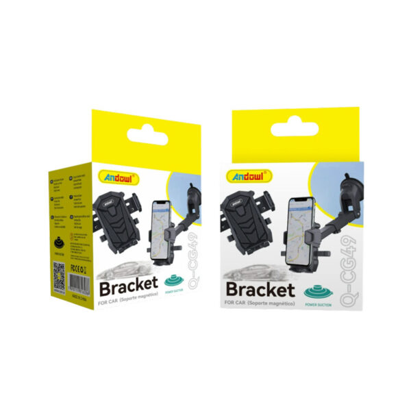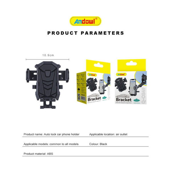 Βάση κινητού αυτοκινήτου της εταιρείας Andowl. Η βάση στηρίζεται με βεντούζα άρα μπορεί να τοποθετηθεί στο ταμπλό ή το παρμπρίζ του αυτοκινήτου. Η στήριξη της συσκεύης στη βάση γίνεται με ρυθμιζόμενα άγκιστρα. Διαθέτει περιστροφή για πιο εύκολη ρύθμιση της επιθυμητής θέσης της συσκευής.
