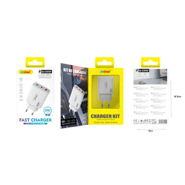 Ο Andowl Q-CD50 είναι ένας ισχυρός φορτιστής τοίχου με μέγιστη ισχύ 65W, ιδανικός για κινητά, tablets και laptops. Υποστηρίζει πολλαπλά πρωτόκολλα γρήγορης φόρτισης (QC 3.0, PD κ.ά.) και διαθέτει δύο θύρες USB-C και μία USB-A, ώστε να φορτίζετε ταυτόχρονα πολλές συσκευές με μέγιστη ταχύτητα και ασφάλεια.