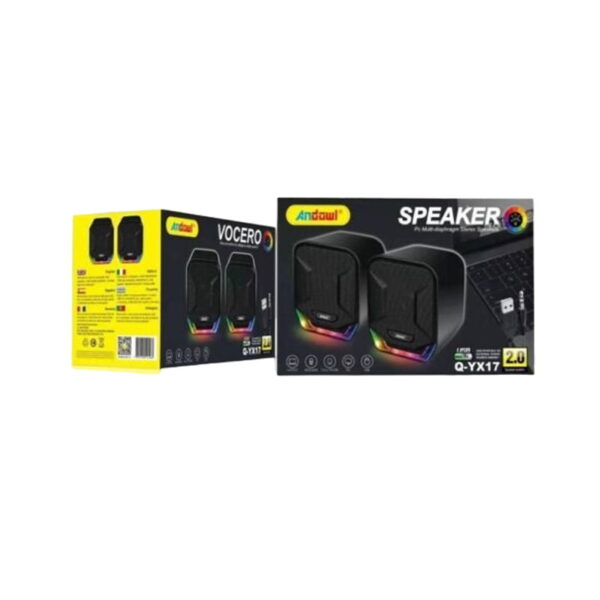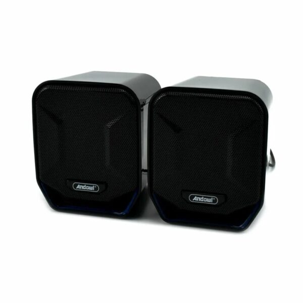 Το σύστημα ηχείων 2.0 της Andowl έχει ισχύ 3 watt, περιλαμβάνει δυο στερεοφωνικά ηχεία που ταιριάζουν σε όσους θέλουν να τα τοποθετήσουν σε μικρό χώρο ή χρειάζονται ηχεία που μεταφέρονται εύκολα. Συνδέεται ενσύρματα με συσκευές που διαθέτουν υποδοχή για το κλασσικό βύσμα καρφί 3.5mm. Η τροφοδοσία τους πραγματοποιείται μέσω καλωδίου usb. Επιπλέον διαθέτει rgb φωτισμό το οποίο δημιουργεί ένα εντυπωσιακό οπτικό αποτέλεσμα ειδικά όταν βρίσκεστε σε συνθήκες χαμηλού φωτισμού.
