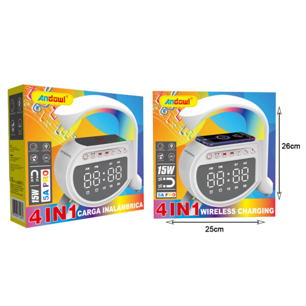 Andowl Ηχείο 4 σε 1 με Bluetooth, ασύρματο φορτιστή, ξυπνητήρι & ρολόι 15W 5A Pro – Wireless Charging Speaker