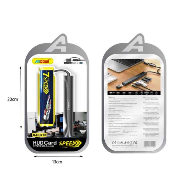 Αναβαθμίστε την παραγωγικότητά σας με το Andowl Q-HU770, έναν κομψό και ισχυρό USB Hub 7 θυρών με θύρες USB 3.0 υψηλής ταχύτητας, ιδανικό για laptop, υπολογιστή και άλλες συμβατές συσκευές. Με ανθεκτική μεταλλική κατασκευή και κομψό design, αποτελεί την ιδανική λύση για όσους χρειάζονται πολλαπλές συνδέσεις χωρίς απώλεια ταχύτητας.