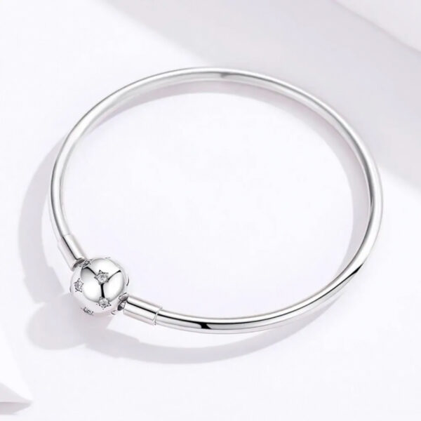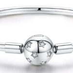 Εντυπωσιακό βραχιόλι χειροπέδα τύπου Pandora, με στρογγυλό κούμπωμα διακοσμημένο με κυβική ζιρκόνια λευκού χρώματος που προσφέρει λάμψη στο κόσμημα.