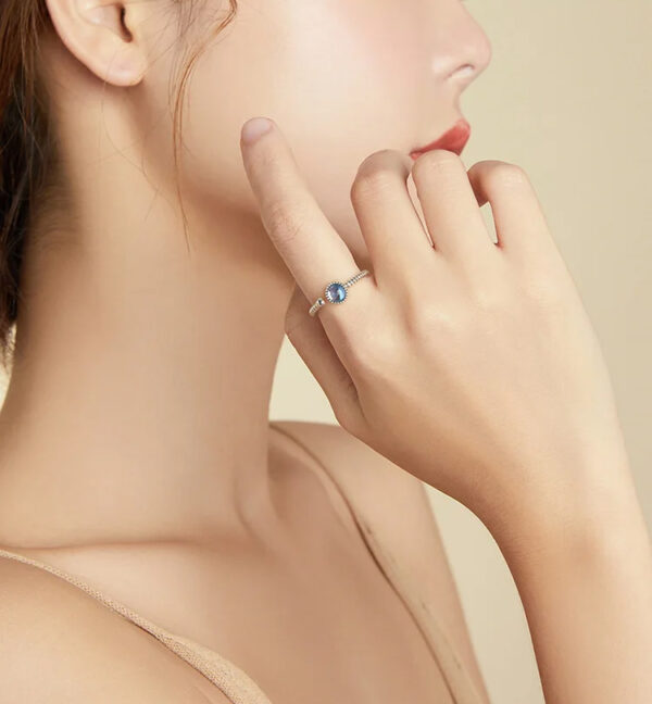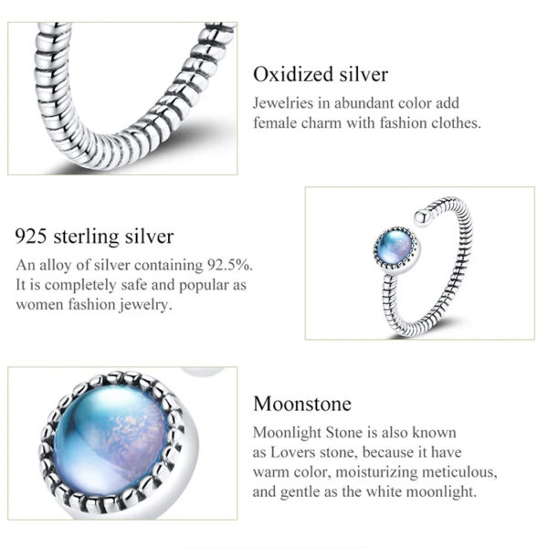 Εντυπωσιακό δαχτυλίδι, διακοσμημένο με συνθετική φεγγαρόπετρα, η οποία αντανακλά μοναδικά το φως και προσφέρει λάμψη στο κόσμημα.