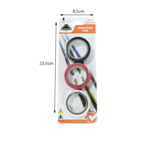 Σετ 3 μονωτικών ταινιών σε μαύρο, κόκκινο και λευκό χρώμα, ιδανικές για ηλεκτρολογικές εφαρμογές, επισκευές και DIY κατασκευές. Κάθε ταινία έχει διαστάσεις 18mm πλάτος και 5 μέτρα μήκος, προσφέροντας ισχυρή πρόσφυση και υψηλή αντοχή στη φθορά και την υγρασία.