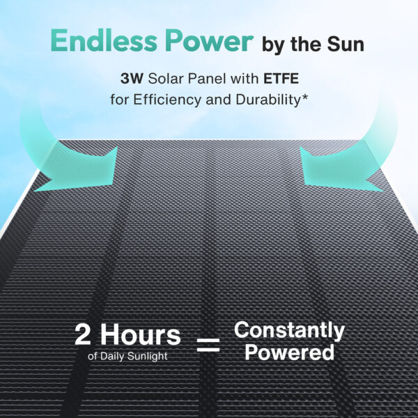Τροφοδοτείται από ενσωματωμένη μπαταρία η οποία επαναφορτίζεται με ηλιακή ενέργεια χάρη στο ηλιακό πάνελ.