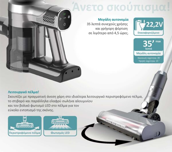 Συνδυάζει 2 λειτουργίες σε μια συσκευή καθώς μπορεί να χρησιμοποιηθεί σαν σκούπα δαπέδων γενικού καθαρισμού αλλά και σαν σκουπάκι χειρός για τοπικό καθάρισμα.