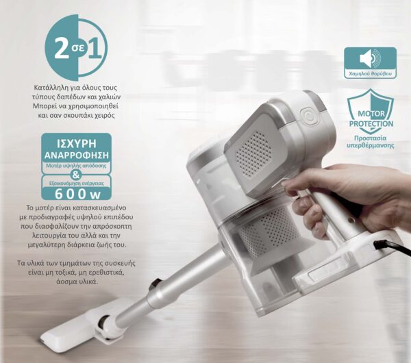 Είναι κατάλληλη για καθάρισμα όλων των τύπων δαπέδων και χαλιών, διαθέτει εξαρτήματα για επιπλέων χρήση σε ταπετσαρίες, έπιπλα και στενές κοιλότητες, ενώ μπορεί να χρησιμοποιηθεί και σαν σκουπάκι χειρός για τοπικό καθάρισμα.