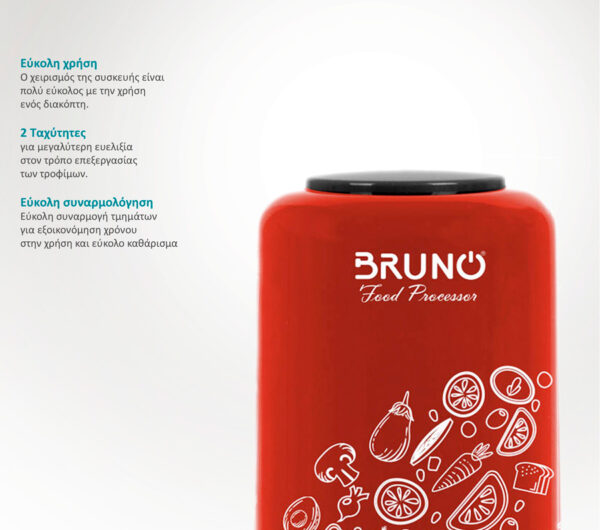 Ο πολυκόπτης της Bruno ψιλοκόβει υλικά όπως λαχανικά ή μυρωδικά, αναμειγνύει σάλτσες, κρέμες κ.α, και αλέθει ξηρούς καρπούς, μπισκότα, παιδικές τροφές κ.α. Εξοπλίζεται με ισχυρό μοτέρ 400W και 4 αιχμηρές λεπίδες από ανοξείδωτο ατσάλι υψηλής αντοχής.