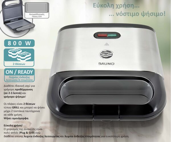 BRUNO τοστιέρα BRN-0165, 2 θέσεων, 800W, αντικολλητικές πλάκες, inox