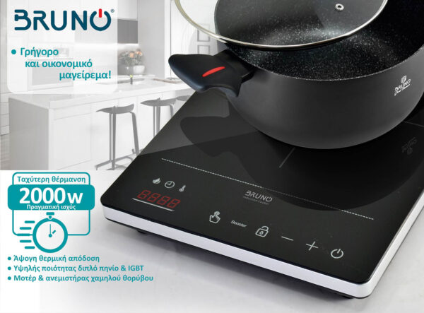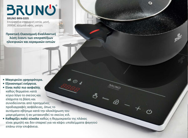 Το πάνελ χειρισμού είναι πλήρως ψηφιακό με κουμπιά αφής. Το μενού του πάνελ είναι προγραμματισμένο ώστε να εξυπηρετεί την πρακτικότητα και παράλληλα η οθόνη LCD και οι βολικές ενδείξεις λειτουργιών ή σφαλμάτων κάνουν το μαγείρεμα με την επαγωγική εστία της Bruno μια πολύ εύκολη διαδικασία.