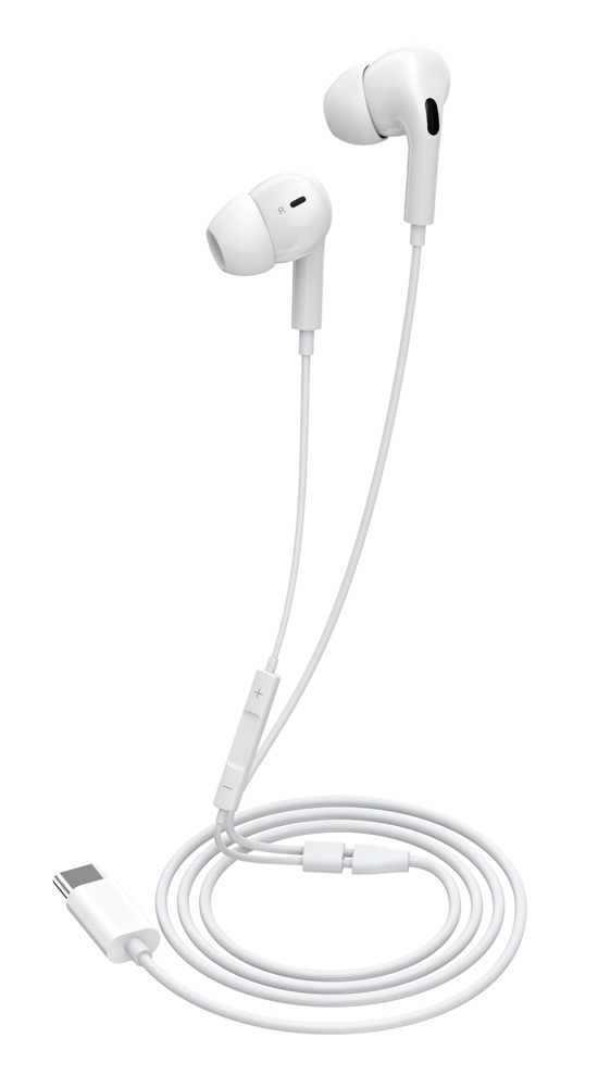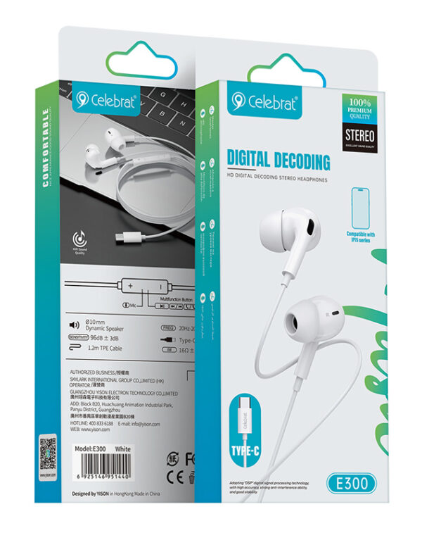 CELEBRAT earphones με μικρόφωνο E300, USB-C σύνδεση, Φ10mm, 1.2m, λευκά