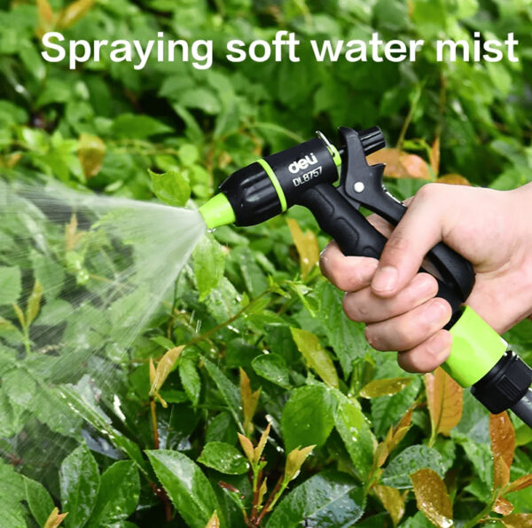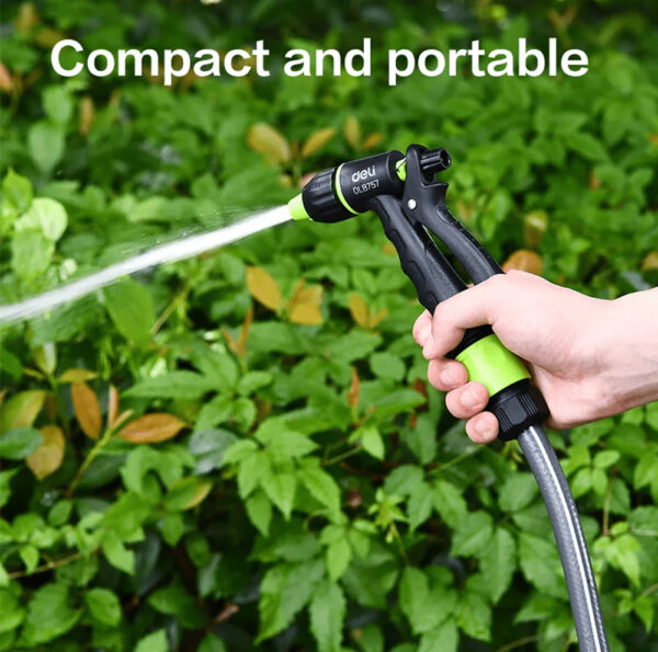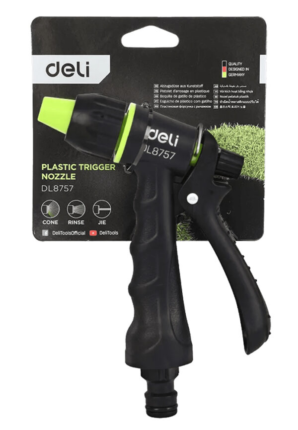 Πιστόλι εκτόξευσης νερού της Deli με 3 λειτουργίες ψεκασμού. Διαθέτει αντιολισθητική λαβή που εφαρμόζει καλά στο χέρι για πιο ξεκούραστο πότισμα.