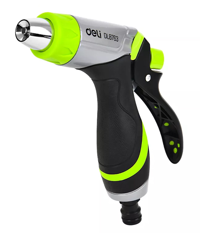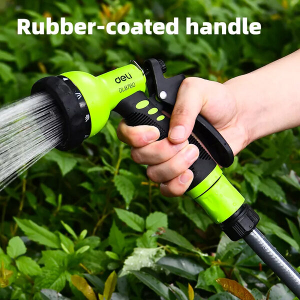 Πιστόλι εκτόξευσης νερού της Deli με 9 λειτουργίες ψεκασμού. Διαθέτει αντιολισθητική λαβή που εφαρμόζει καλά στο χέρι για πιο ξεκούραστο πότισμα.