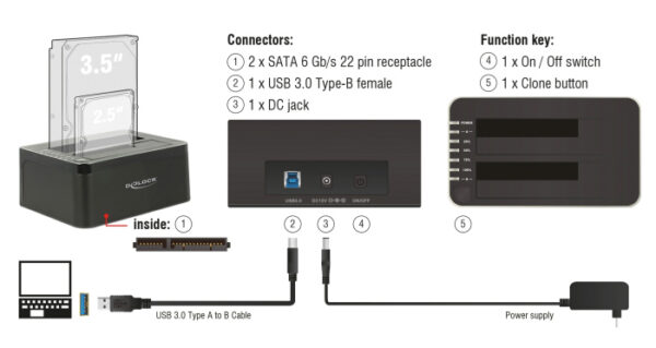 Αυτό το docking station της Delock επιτρέπει την σύνδεση έως δύο 2.5" ή 3.5" SATA HDD ή SSD σε έναν υπολογιστή μέσω θύρας USB.
