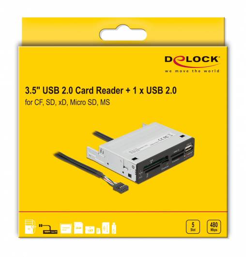 Αυτό το card reader της Delock συνδέεται στην μητρική κάρτα του PC σας σε μια ελεύθερη θύρα USB 9-pin και μπορεί να τοποθετηθεί σε ένα ελεύθερο 3.5" bay του case σας. Διαθέτει πέντε διαφορετικές υποδοχές ανάγνωσης καρτών και μια υποδοχή USB.