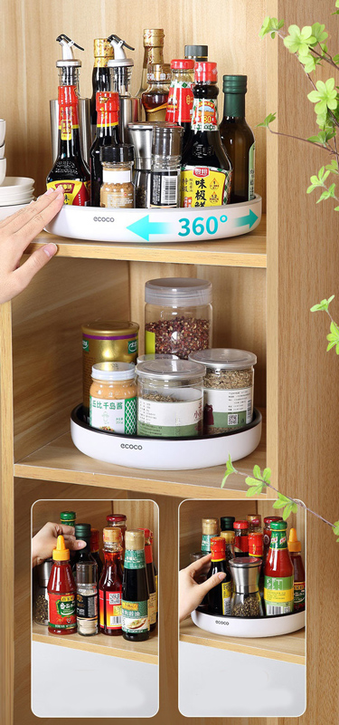 Επιτραπέζια βάση κουζίνας της Ecoco με περιστροφή 360°. Στην βάση μπορείτε να τοποθετήσετε μπουκάλια, βάζα, φρούτα κ.α. ενώ η τοποθέτηση της μπορεί να γίνει σε οποιαδήποτε επιτραπέζια επιφάνεια, μέσα σε ντουλάπι ή ράφι. Η περιστροφή 360° της βάσης, σας δίνει την δυνατότητα να επιλέγετε τα προϊόντα που επιθυμείτε, είτε αυτά βρίσκονται στο μπροστινό, είτε στο πίσω μέρος της βάσης χωρίς να χρειάζεται να μετακινήσετε τα υπόλοιπα προϊόντα. Το κάτω μέρος της βάσης είναι σχεδιασμένο με αντιολισθητικό υλικό εξασφαλίζοντας την σταθερότητα της κατά την διάρκεια της περιστροφής.