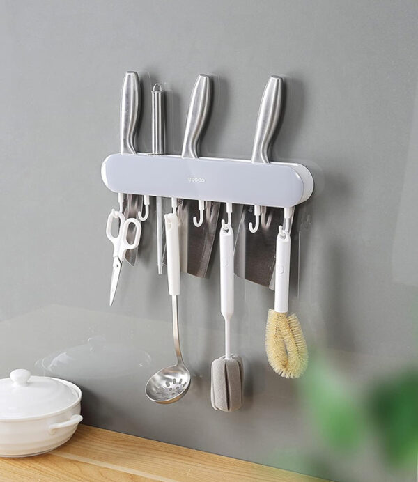Κρεμάστρα της ECOCO, ιδανική για την κουζίνα. Εξοπλίζεται με 7 γάντζους για την αποθήκευση μικροαντικειμένων, διαφόρων σκευών, πετσετών κ.α, ενώ, στο πάνω μέρος της, διαθέτει βάσεις αποθήκευσης για μαχαίρια.
