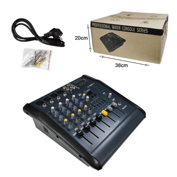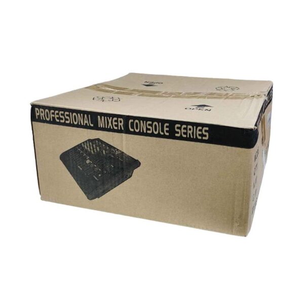 μίξερ nalog, σχεδιασμός κυκλώματος εξαιρετικά χαμηλού θορύβου υψηλής ποιότητας, χώρος κεφαλής Είσοδος μικροφώνου/γραμμής 4/8/12 καναλιών Κανάλι ισοσταθμιστή δύο κυμάτων, ζεστή ηχόχρωμα, μιούζικαλ Το οπίσθιο εφέ που μεταφέρει ένα putter ανά κανάλι για εξωτερικές συσκευές εφέ Ενσωματωμένα ψηφιακά μικτά αναπνευστικά εφέ 16 DSP Ο σχεδιασμός πρόσβασης USB, με οθόνη LCD, μπορεί να τοποθετηθεί απευθείας σε δίσκο U για αναπαραγωγή μουσικής MP3 48V phantom power για υποστήριξη της άμεσης χρήσης συμπυκνωτικών μικροφώνων Κύριος σχεδιασμός εξόδου στερεοφωνικού ισοσταθμιστή 5 ζωνών Έξοδος παρακολούθησης/εγγραφής στερεοφωνικών ακουστικών Ένδειξη επιπέδου 2 δρόμων υψηλής ακρίβειας Οι βαθμοί υψηλών 60 χιλιοστών ανθεκτικοί με faders Υψηλής ποιότητας εξαρτήματα και εξαιρετικά στιβαρή κατασκευή, ανθεκτικότητα Απόκριση συχνότητας 20~20 kHz THD+N ≤0,4% (1KHz, 0,775V) Αναλογία S/N ≥85dB Τάση ισχύος 160V~240V 50/60Hz Εξίσωση LF 80Hz±15dB MF 2,5KHz±15dB HF 12KHz±15dB Εξάρτημα ενισχυτή Ισχύς εξόδου 200W×2(4Ω) THD+N ≤0,05%(1KHz,80Ω)
