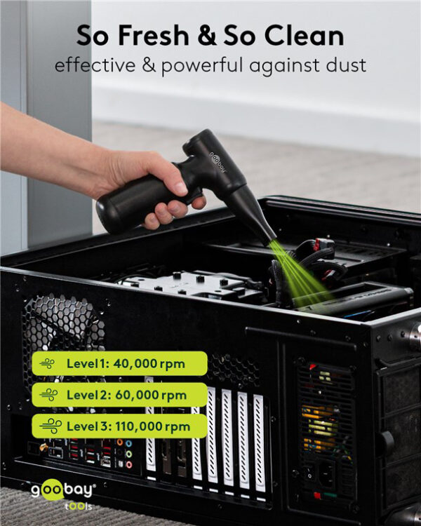 Ηλεκτρικό air duster της Goobay, κατάλληλο για την απομάκρυνση της σκόνης από αξεσουάρ και οικιακά αντικείμενα όπως πληκτρολόγια, PC cases, κλιματιστικά, ηλεκτρονικές συσκευές κ.α.