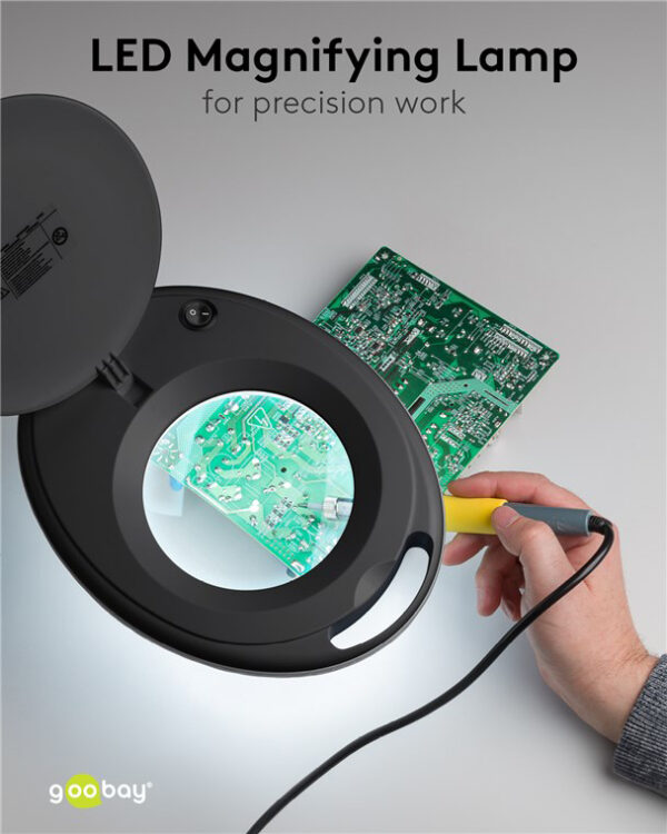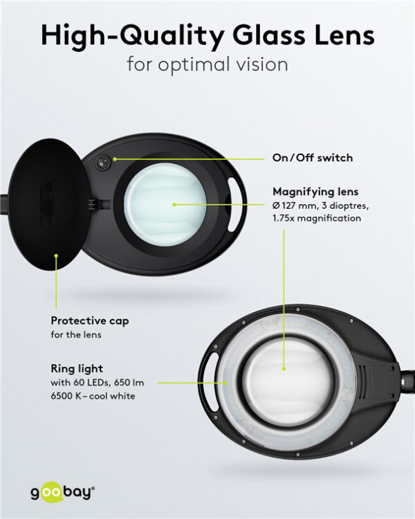 Μεγεθυντικός φακός της Goobay διαμέτρου 127mm, με 3 διόπτρες και μεγέθυνση 1.75x. Διαθέτει προστατευτικό καπάκι για την κάλυψη του φακού όταν δεν χρησιμοποιείται και φωτιστικό δακτύλιο με 60 SMD LED υψηλής απόδοσης για άνετη εργασία ακόμη και σε σκοτεινά μέρη. Ο βραχίωνας του είναι αρθρωτός και υποστηρίζει ρύθμιση κλίσης και περιστροφή, γεγονός που προσφέρει μεγαλύτερη ευελιξία κατά την διάρκεια των εργασιών σας.
