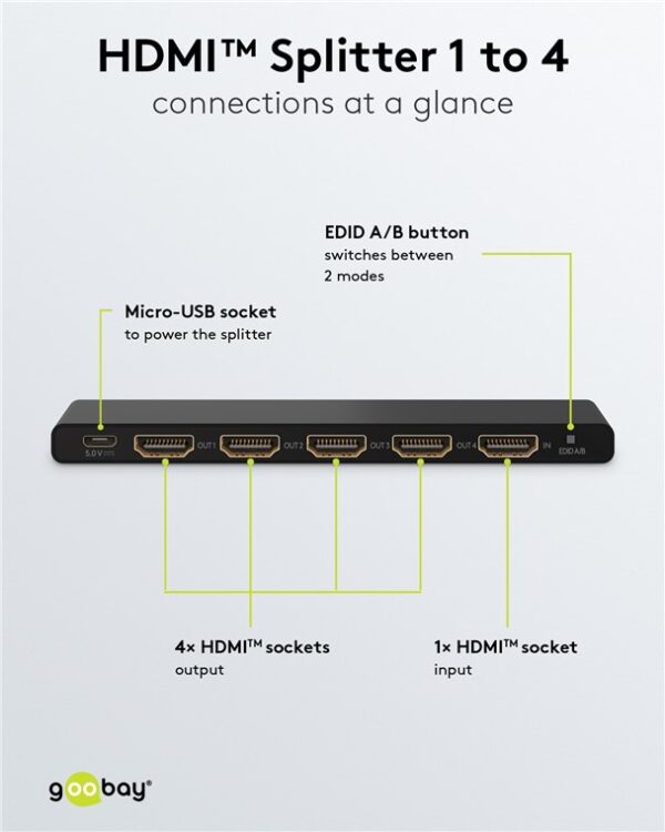 Το HDMI splitter της Goobay σας επιτρέπει την σύνδεση 1x συσκευής εισόδου όπως PC σε 4x συσκευών εξόδου όπως οθόνες.
