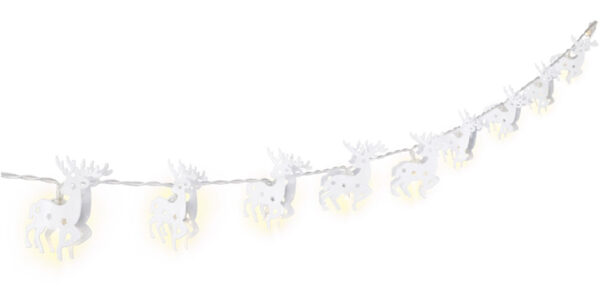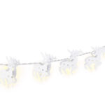 Λαμπάκια LED με διακοσμητικούς μεταλλικούς τάρανδους σε λευκό χρώμα που συνδέονται με ένα διαφανές καλώδιο συνολικού μήκους 1.3 μέτρα. Είναι ιδανικά για την χριστουγεννιάτικη διακόσμηση σε οποιονδήποτε εσωτερικό χώρο.