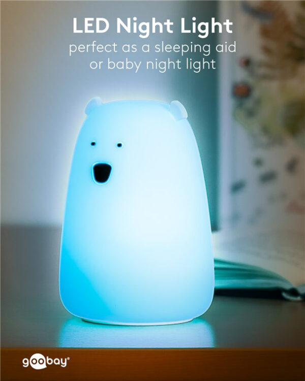 Χαρίστε στο παιδικό δωμάτιο μια ζεστή και χαλαρωτική ατμόσφαιρα με το LED φωτιστικό νυκτός της Goobay σε σχήμα χαριτωμένης πολικής αρκούδας.