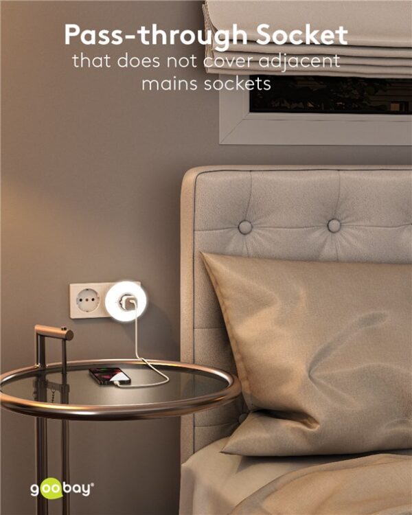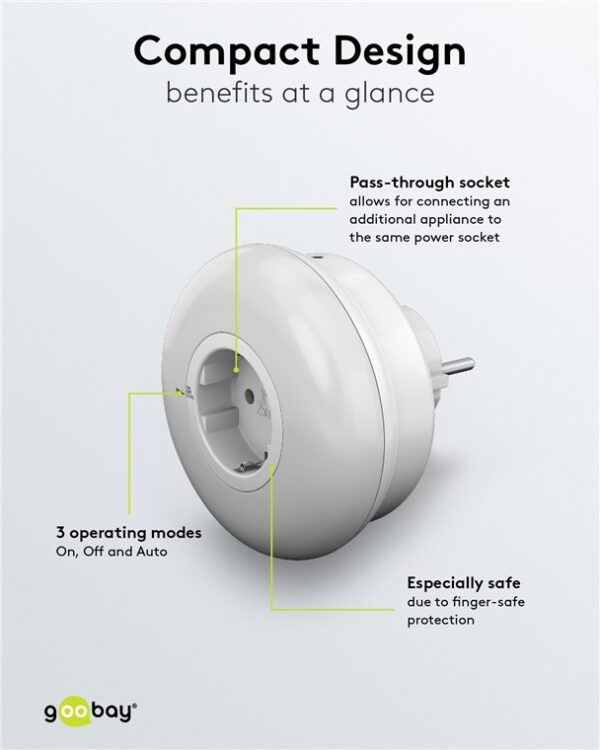Φωτιστικό νυκτός LED της Goobay με passthrough πρίζα schuko για την αξιοποίηση της πρίζας του σπιτιού. Εξοπλίζεται με αισθητήρα φωτός για την αυτόματη ενεργοποίηση του φωτιστικού όταν η φωτεινότητα φτάσει σε επίπεδο κάτω από 21 lx.