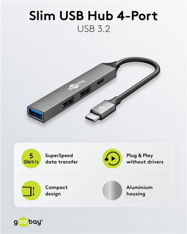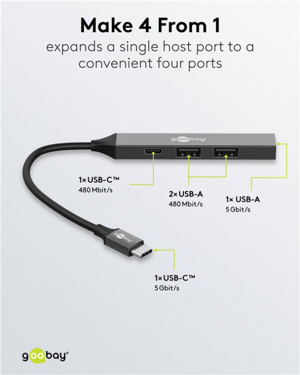 GOOBAY USB hub 74459, 4x θυρών, USB 3.2, 5Gbps, USB-C σύνδεση, γκρι