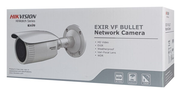 Δικτυακή κάμερα POE IP της σειράς HiWatch από την HIKVISION, με varifocal φακό 2.8-12mm και ανάλυση 2K με αισθητήρα 4MP. Τα βίντεο που καταγράφονται αποθηκεύονται με κωδικοποίηση Η.265+ ενώ το εύρος υπερύθρων IR της κάμερας φτάνει έως 50m. Το σώμα της κάμερας είναι κατασκευασμένο από ανθεκτικό μεταλλικό υλικό με αδιάβροχη προστασία IP67 και υποστηρίζει καταγραφή σε κάρτα micro SD έως 256GB (δεν συμπεριλαμβάνεται).