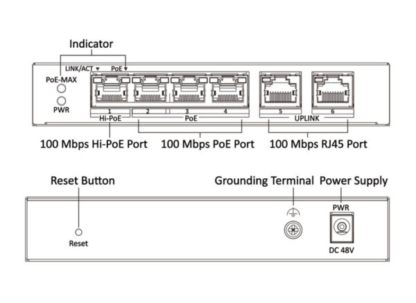 Port Number: 4x 100 Mbps PoE RJ45 port, and 2x 100 Mbps network RJ45 ports