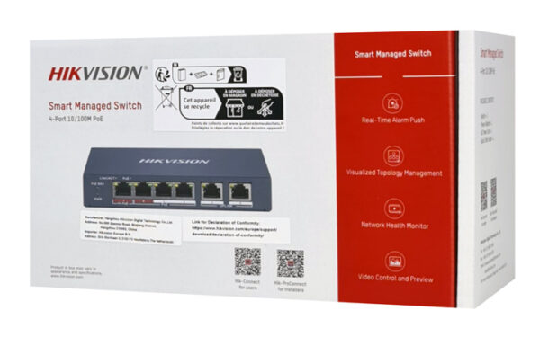 Το switch της Hikvision επεκτείνει το δίκτυο σας με 4x θύρες δικτύου PoE με ταχύτητες 10/100Mbps. Είναι ιδανικό για χρήση με συστήματα ασφαλείας, συναγερμούς, κάμερες κ.λπ.