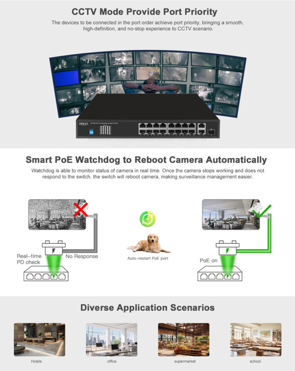 Διαθέτει έξυπνη λειτουργία αυτόματης επανεκκίνησης καμερών, χάρη στην οποία το switch μπορεί να εντοπίσει σε πραγματικό χρόνο, την διακοπή της λειτουργίας των συνδεδεμένων καμερών, και να επαναφέρει την λειτουργία τους ώστε να μην χαθεί σημαντικός χρόνος παρακολούθησης.