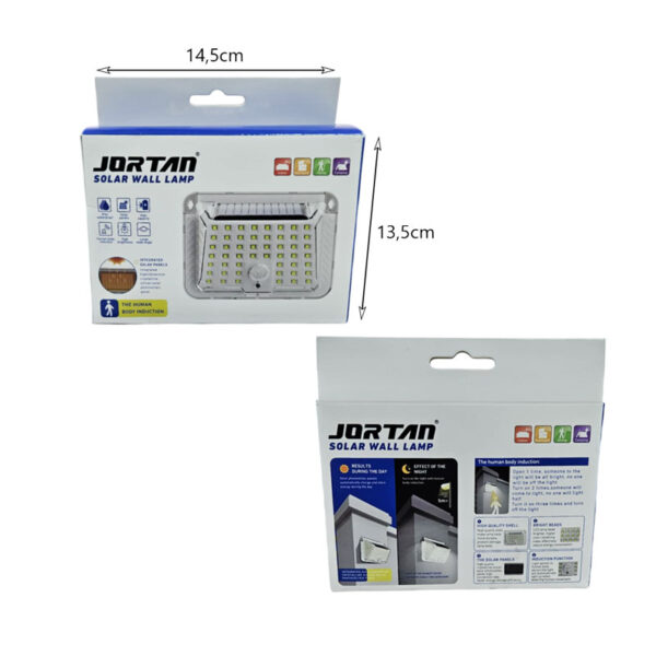 Φωτίστε τον εξωτερικό σας χώρο με το ηλιακό φωτιστικό τοίχου JORTAN! Διαθέτει 48 ισχυρά LED, αισθητήρα ανίχνευσης κίνησης και ηλιακό πάνελ για απόλυτη εξοικονόμηση ενέργειας χωρίς καλώδια ή ρεύμα. Ενεργοποιείται αυτόματα όταν εντοπίζει κίνηση και προσφέρει έντονο φως ιδανικό για αυλές, μπαλκόνια, γκαράζ, αποθήκες ή είσοδοι.