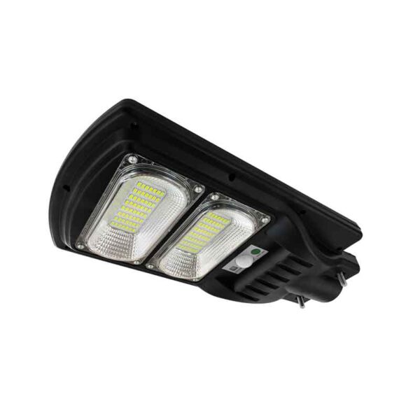 Ηλιακό φωτιστικό δρόμου σε μαύρο χρώμα, που συγκεντρώνει και αποθηκεύει ηλιακή ενέργεια για τη λειτουργία του, ώστε να μη χρειάζεται να συνδεθεί σε παροχή ρεύματος. Διαθέτει ανιχνευτή κίνησης για να ενεργοποιείται όταν εντοπίσει κίνηση εντός της εμβέλειάς του. Περιλαμβάνει τηλεκοντρόλ ώστε να το χειρίζεστε από απόσταση.