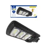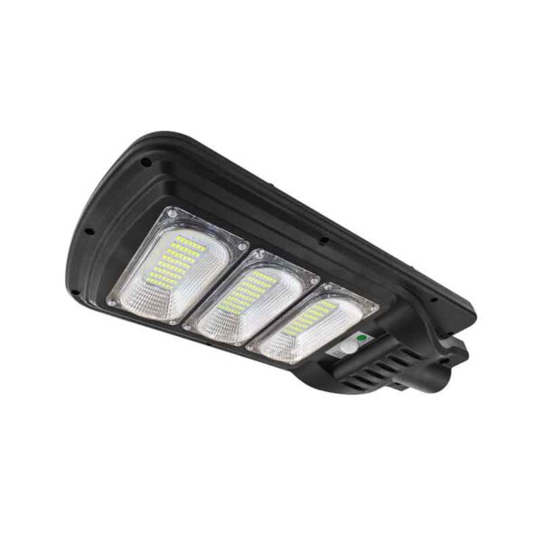 Ηλιακό φωτιστικό δρόμου σε μαύρο χρώμα, που συγκεντρώνει και αποθηκεύει ηλιακή ενέργεια για τη λειτουργία του, ώστε να μη χρειάζεται να συνδεθεί σε παροχή ρεύματος. Διαθέτει ανιχνευτή κίνησης για να ενεργοποιείται όταν εντοπίσει κίνηση εντός της εμβέλειάς του. Περιλαμβάνει τηλεκοντρόλ ώστε να το χειρίζεστε από απόσταση.