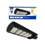 Ηλιακό φωτιστικό δρόμου σε μαύρο χρώμα, που συγκεντρώνει και αποθηκεύει ηλιακή ενέργεια για τη λειτουργία του, ώστε να μη χρειάζεται να συνδεθεί σε παροχή ρεύματος. Διαθέτει ανιχνευτή κίνησης για να ενεργοποιείται όταν εντοπίσει κίνηση εντός της εμβέλειάς του. Περιλαμβάνει τηλεκοντρόλ ώστε να το χειρίζεστε από απόσταση.