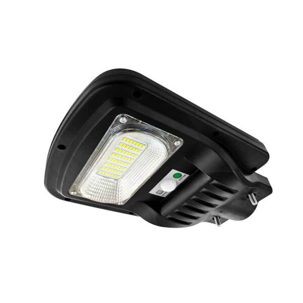 Ηλιακό φωτιστικό δρόμου σε μαύρο χρώμα, που συγκεντρώνει και αποθηκεύει ηλιακή ενέργεια για τη λειτουργία του, ώστε να μη χρειάζεται να συνδεθεί σε παροχή ρεύματος. Διαθέτει ανιχνευτή κίνησης για να ενεργοποιείται όταν εντοπίσει κίνηση εντός της εμβέλειάς του. Περιλαμβάνει τηλεκοντρόλ ώστε να το χειρίζεστε από απόσταση.