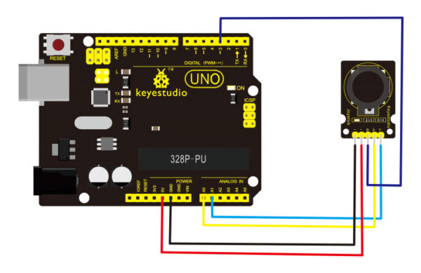 Πολλά ρομποτικά projects χρειάζονται joystick. Αυτό το module της Keyestudio συνδέεται σε δύο αναλογικές εισόδους επιτρέποντας σας να δίνετε εντολές στο ρομπότ σας με χειριστήριο X, Y. Επιπλέον διαθέτει διακόπτη που είναι συνδεδεμένος σε digital pin και μπορεί να συνδεθεί εύκολα στο Arduino από το IO Shield.